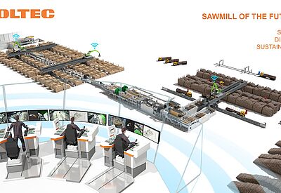 The sawmill of the future is far more than a modern production facility – it is an intelligent, interconnected hub within a fully digital and sustainable value chain. From log logistics to final product delivery, every process is captured, analysed, and controlled in real time. Sensors, AI, and automation enable a learning production system that adapts dynamically to material properties, order volumes, and energy requirements.