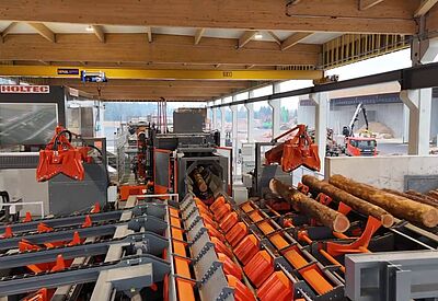Die neue Sägelinie wird zuverlässig durch eine leistungsstarke HOLTEC Sägewerksbeschickung versorgt – ein durchdachtes Gesamtkonzept für hohe Leistung und Betriebssicherheit.