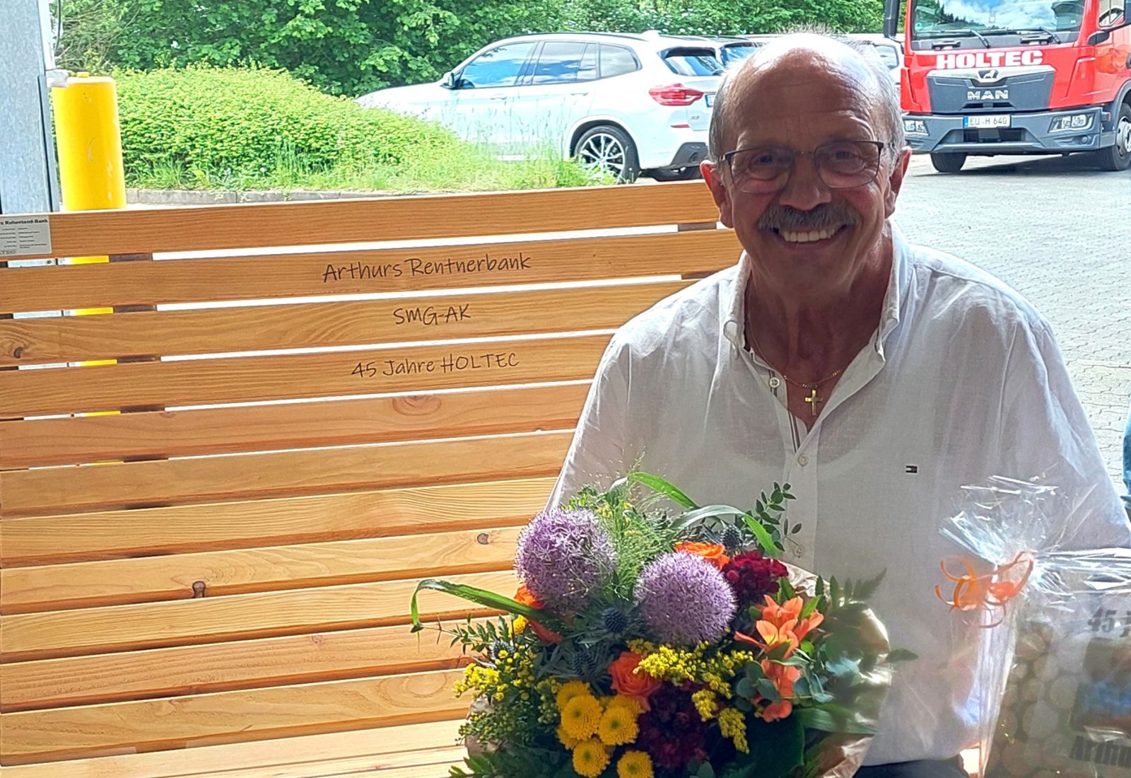Im Mai 2024 durften wir ein ganz besonderes Jubiläum feiern: Arthur Klinkhammer erreichte sein 45-jähriges Dienstjubiläum – eine unglaubliche Leistung, die nur wenige erreichen – und verabschiedete sich kurz darauf in den wohlverdienten Ruhestand. Arthur begann seine Karriere am 15. Mai 1979 als Elektriker bei Holtec. 1988 wechselte er als Elektromonteur in unsere Montageabteilung und leistete von dort aus einen entscheidenden Beitrag zum erfolgreichen Aufbau unserer Projekte. Dank seines unermüdlichen Einsatzes und seiner Fachkompetenz übernahm er später die Abteilungsleitung im Bereich Service, Montage und Garantie. Mit Fachwissen, Leidenschaft und einer beeindruckenden Loyalität prägte Arthur nicht nur unser Unternehmen, sondern auch die Zusammenarbeit im Team. Seine Kolleginnen und Kollegen sowie die Geschäftsleitung schätzten ihn als engagierten und zuverlässigen Partner, auf den man immer zählen konnte. Seine 45 Jahre bei Holtec sind nicht nur ein beeindruckendes berufliches Kapitel, sondern auch ein Vorbild für Hingabe und Beständigkeit. Zum Abschied schenkte ihm die Abteilung eine Rentnerbank – ein kleines Symbol für die vielen geschaffenen Meilensteine und den neuen Lebensabschnitt, der vor ihm liegt. Die gesamte Belegschaft wünscht Arthur für die Zukunft alles Gute, Gesundheit und viele entspannte Stunden. Danke für 45 unglaubliche Jahre, Arthur – du wirst bei uns fehlen!