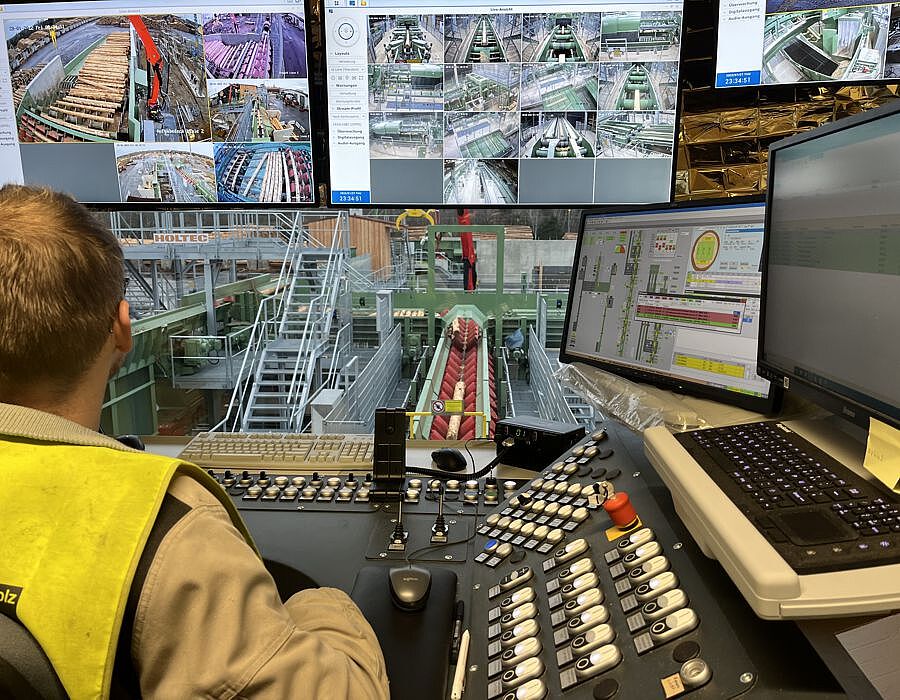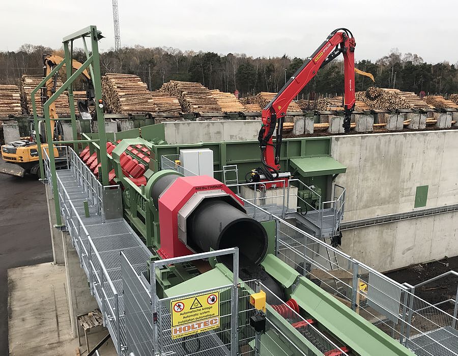 HOLTEC entwickelte ein leistungsstarkes Beschickungskonzept mit zwei parallelen, baugleichen Linien. Diese sorgen für maximale Flexibilität und gewährleisten eine kontinuierliche Versorgung der Sägelinie.