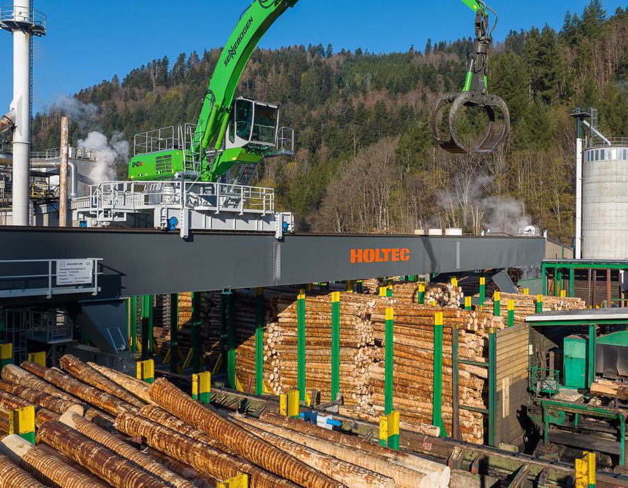 Nach einem folgenreichen Unfall im März 2022 fiel der bestehende Seilportalkran auf dem Rundholzplatz von Dold plötzlich aus. Da dieser für die Entleerung der Rundholzboxen und die Beschickung der Sägelinien zentral war, musste kurzfristig ein neues Umschlagkonzept entwickelt werden. Ziel war erneut ein schienengebundener Portalkran – jedoch auf modernstem technischen Niveau und mit Blick auf nachhaltige, effiziente Produktionsprozesse. Erste Überlegungen für ein neues Rundholzplatz-Konzept, inklusive modernem Portalkran, hatten Dold und Holtec bereits zuvor gemeinsam angestoßen.