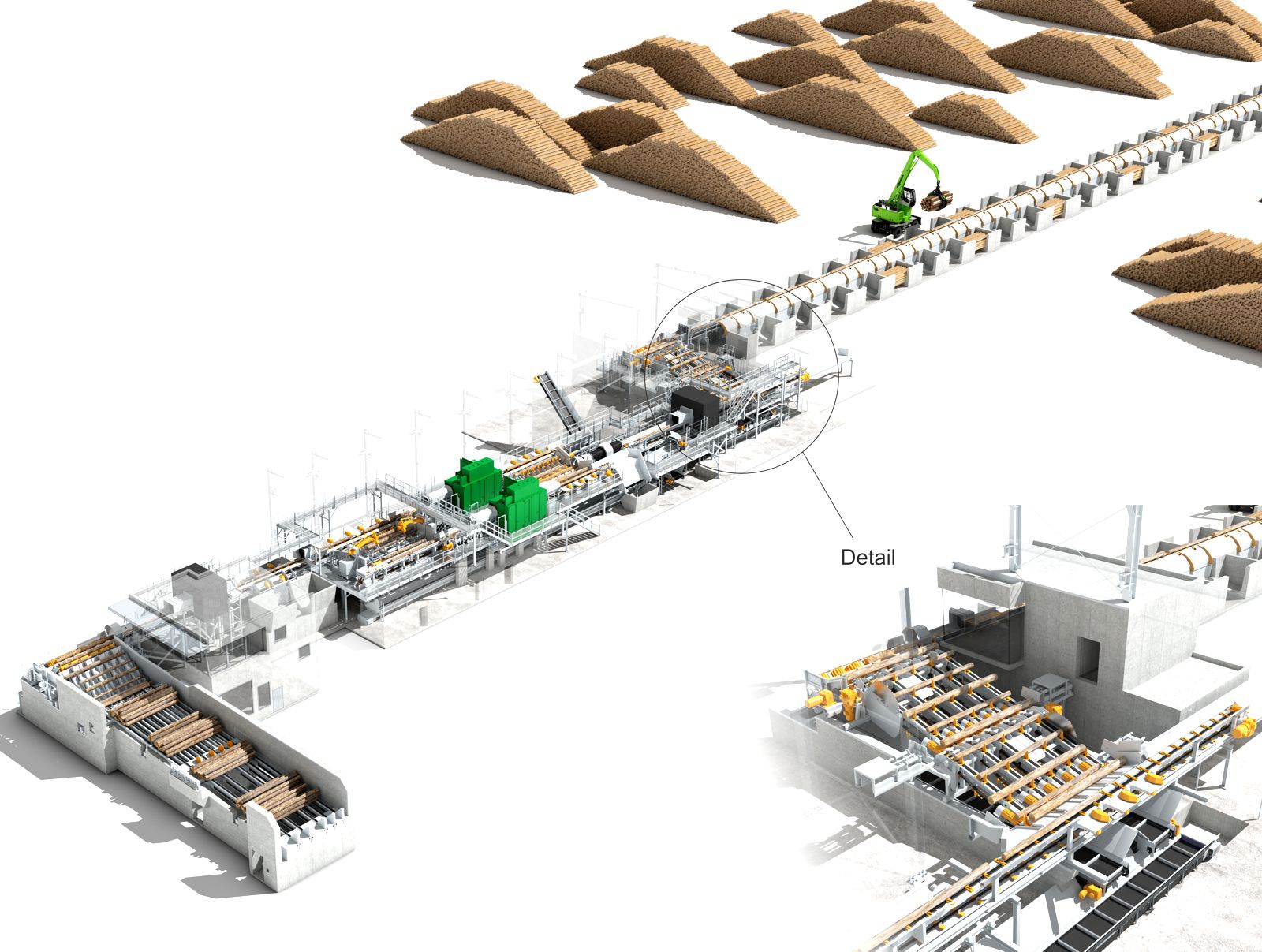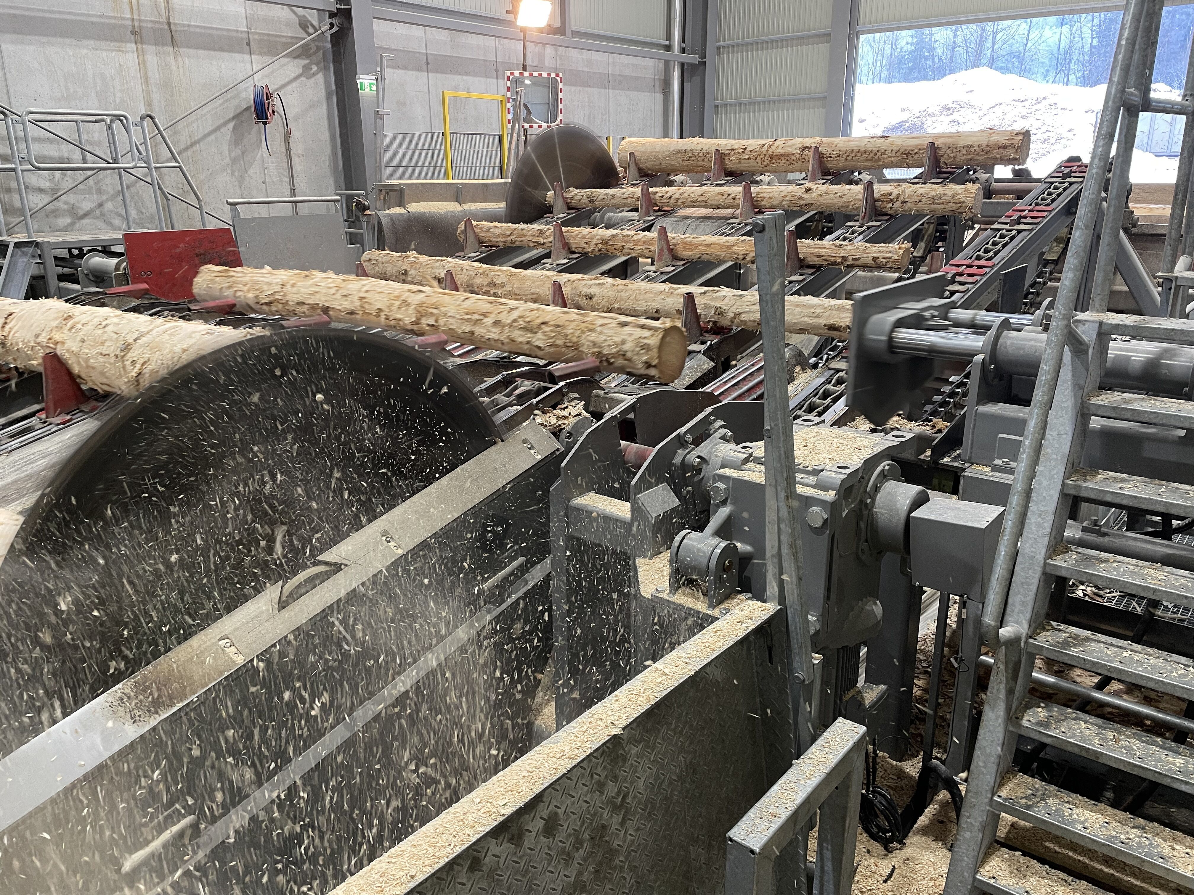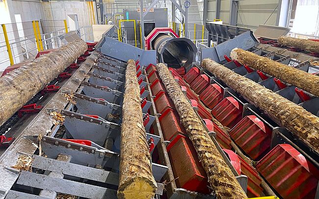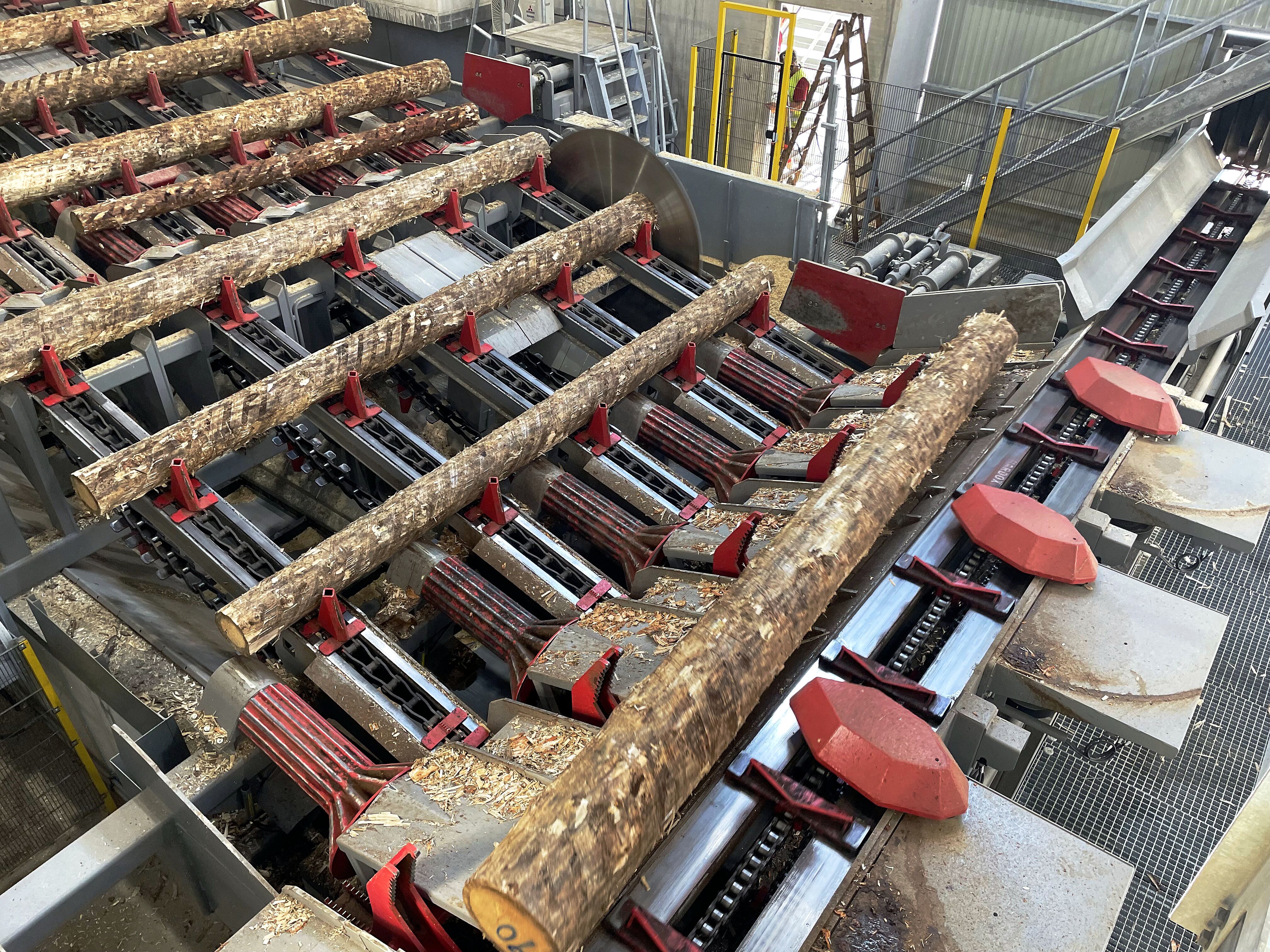 Die neue Anlage verarbeitet 3 bis 5,5 m lange Hölzer. Nach der Vereinzelung per Stufenschieber erfolgt ein erster Scan, anschließend die Entrindung über zwei Nicholson-Maschinen – für dünne bzw. starke Stämme – inklusive vorgeschaltetem Doppelwellenreduzierer. Weitere Qualitätskontrollen (Metalldetektor und Scanner), Kappsägen und 62 Sortierboxen komplettieren die Linie.