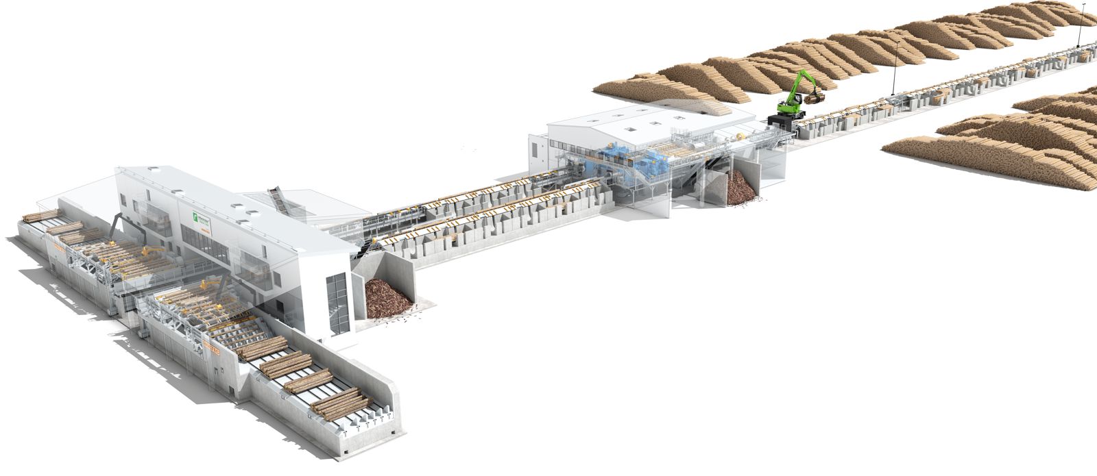 Aufgrund der geplanten Durchsatzmenge entschied sich Rettenmeier für ein Zwei-Linien-Konzept. Ziel war es, die LKW-Entladung zu entzerren, die Holzverfügbarkeit zu erhöhen und eine stabile, durchgängige Beschickung der Sortierung sicherzustellen.