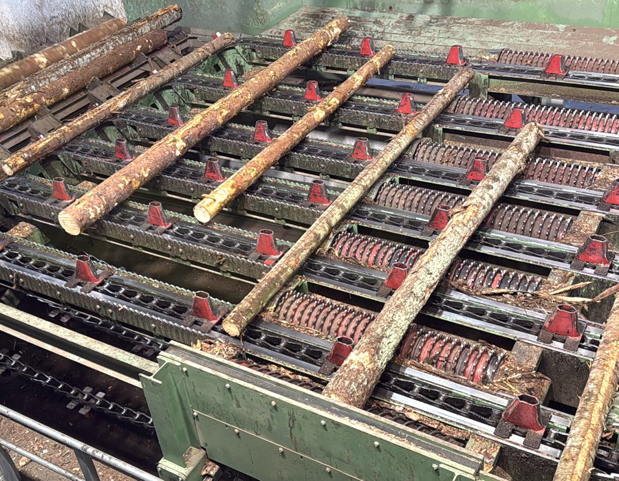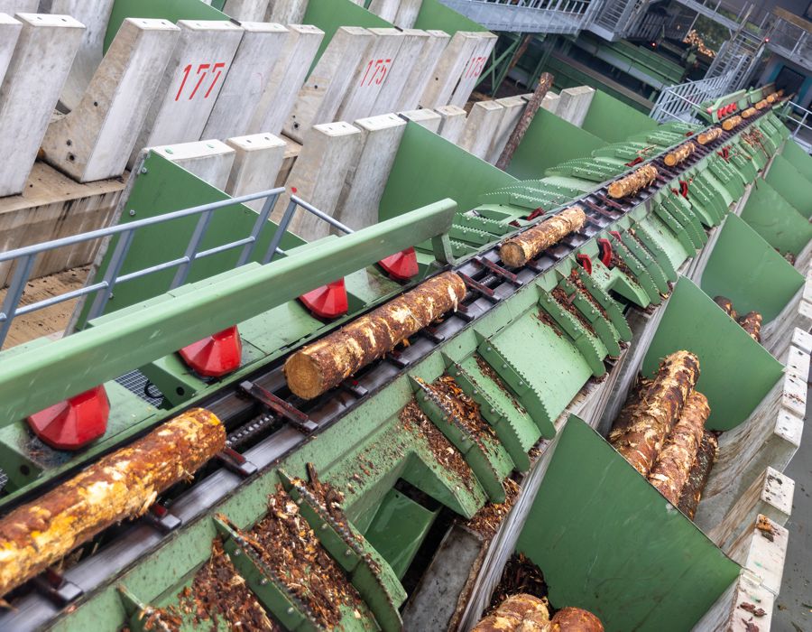 Je nach Zustand erfolgt eine Erdstammreduzierung, bevor die Stämme der Entrinderlinie zugeführt werden. Dort werden sie durch Logrunner beschleunigt, mittels Röntgentechnologie vermessen und bei Bedarf vor dem Entrinden ausgeschleust. Beide Linien sind mit einrotorigen Valon-Kone-Entrindern ausgestattet – wobei eine vorhandene Maschine erfolgreich integriert wurde. So konnten Investitionskosten eingespart werden, ohne die Gesamtleistung zu reduzieren.