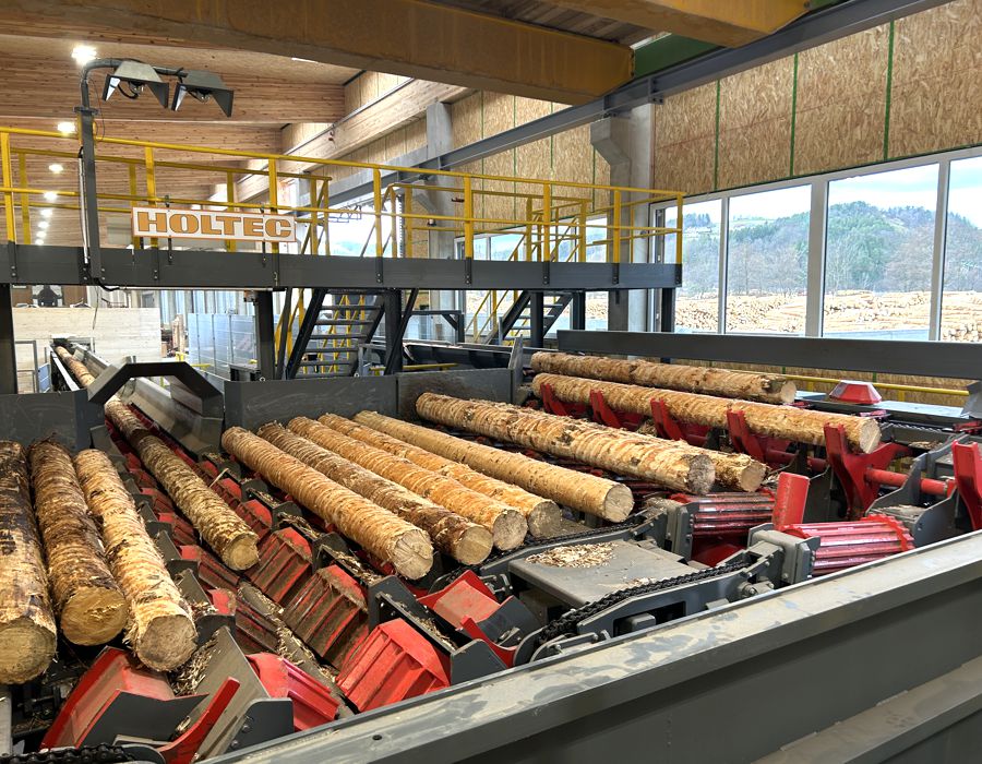 HOLTEC entwickelte eine leistungsstarke, platzoptimierte Beschickungslösung, deren Herzstück drei Logrunner, ein Tandemstufenschieber sowie eine weiterentwickelte Drehscheibe bilden. Die beidseitige Beschickung der Sägelinie ermöglicht eine kompakte Bauweise bei gleichzeitig hoher Performance.