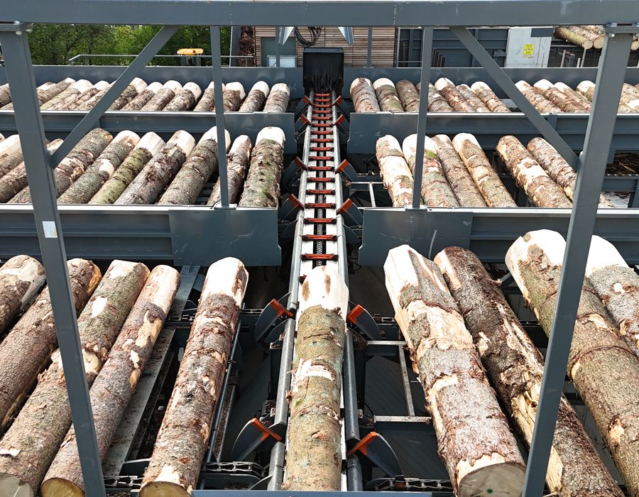 Herzstück der Anlage sind sechs neu entwickelte Pufferdecks, die Zwischenlagern, Vorsortieren und Sägebeschickung in einem System vereinen. Der Auswerfer fungiert gleichzeitig als Zuteiler – eine platzsparende, wirtschaftliche Lösung mit hoher Gesamtleistung. Der komplette Rundholzplatz kann dadurch von nur einem Bediener gesteuert werden.